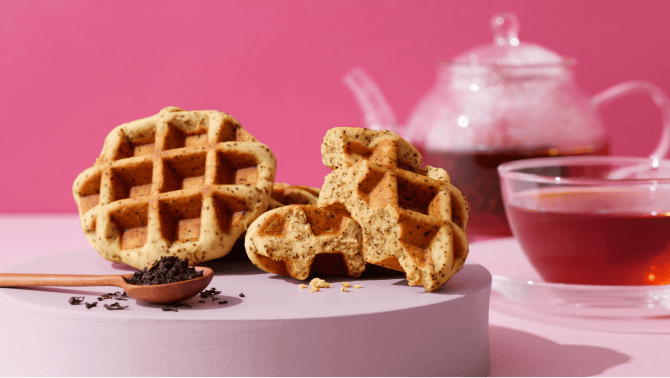 全粒粉やおからを使って焼き上げた、むぎゅっと食感のワッフルです。アールグレイが華やかに香り、やさしい甘さに仕上げました。