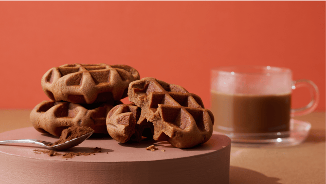 全粒粉やおからを使って焼き上げた、むぎゅっと食感のワッフルです。やさしいココア味で、甘さ控えめに仕上げました。おからベースの生地なので腹持ちがよく、小腹満たしにぴったりです。