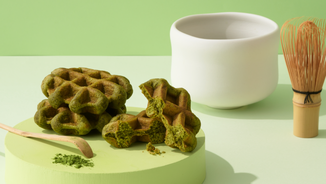 全粒粉やおからを使ってしっとり焼き上げた、むぎゅっと食感のワッフルです。抹茶の上品で、深みのある味わいに仕上げました。