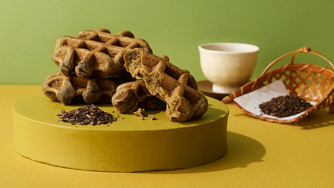 全粒粉やおからを使ってしっとり焼き上げた、むぎゅっと食感のワッフルです。ほうじ茶の香ばしい香りが引き立ち、上品な甘さに仕上げました。むぎゅっと食感なので腹持ちがよく、小腹満たしにぴったりです。