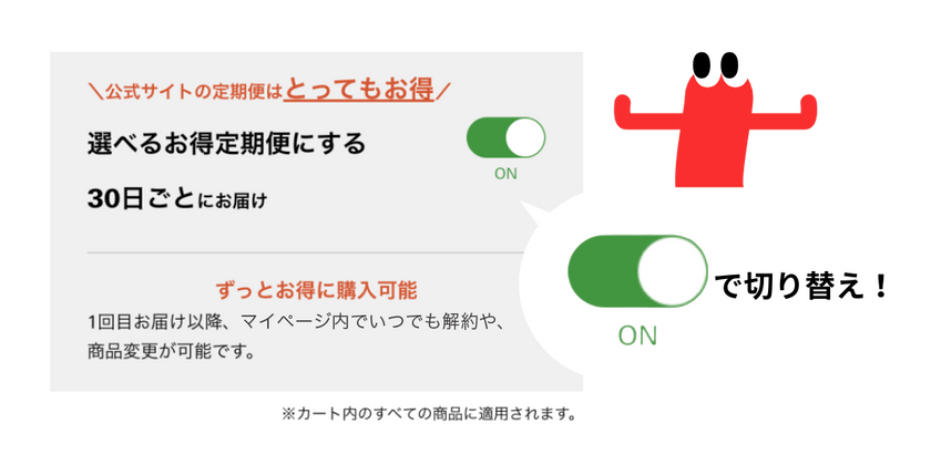 1回目お届け以降、マイアカウント内でいつでも解約や、商品変更が可能です。※カート内のすべての商品に適用されます。