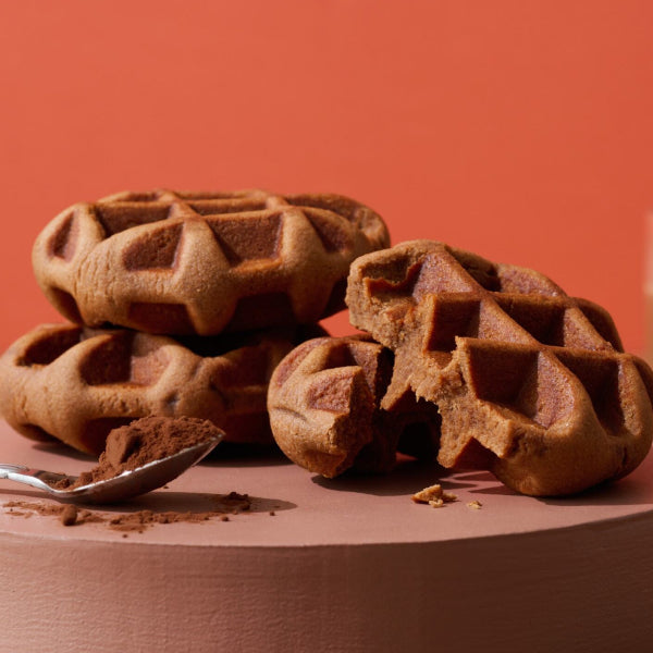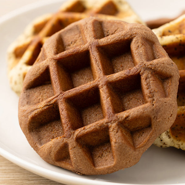 全粒粉やおからを使って焼き上げた、むぎゅっと食感のワッフルです。やさしいココア味で、甘さ控えめに仕上げました。おからベースの生地なので腹持ちがよく、小腹満たしにぴったりです。