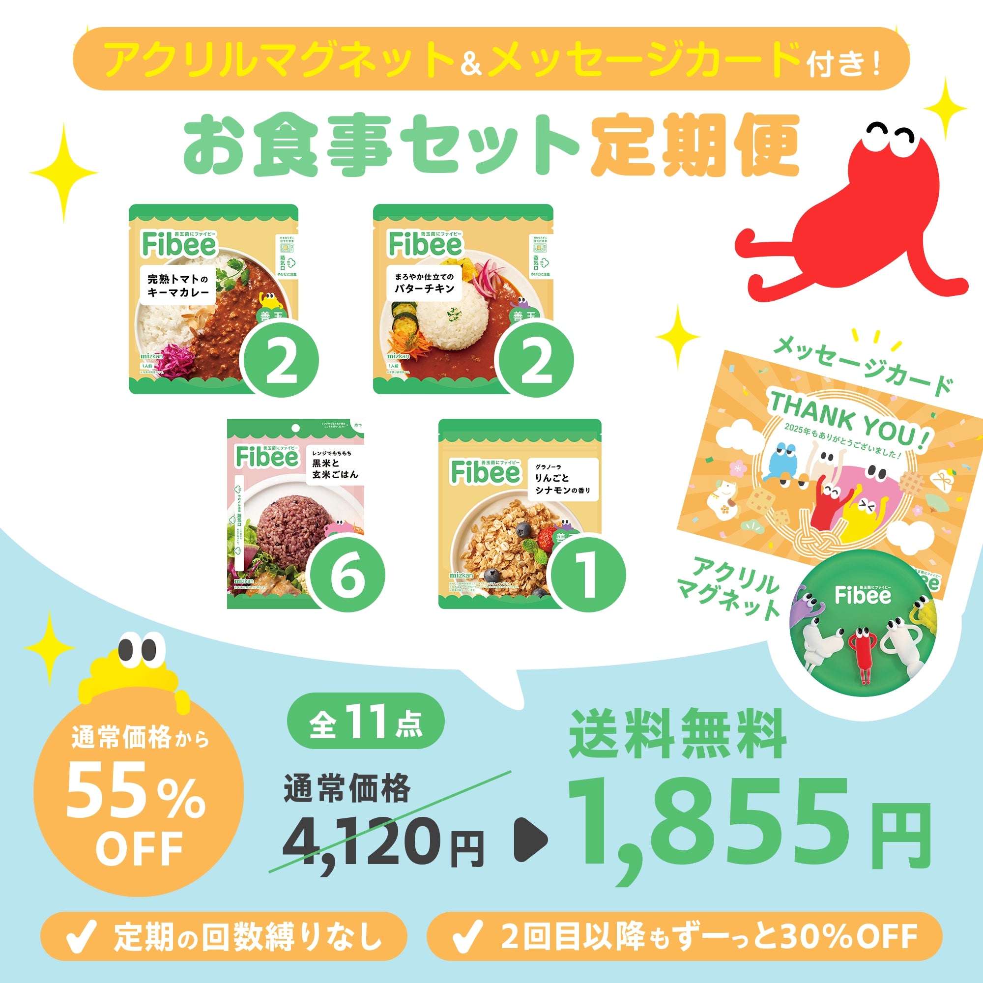 Fibee商品を定期便で5,000円以上購入した場合、通常の定期便30%割引に加えて、さらに商品1つあたり2%OFFとなる割引です。初回購入以降に商品内容を変更される場合でも、Fibeeの商品金額合計が5,000円以上であれば2%割引が適用されます。