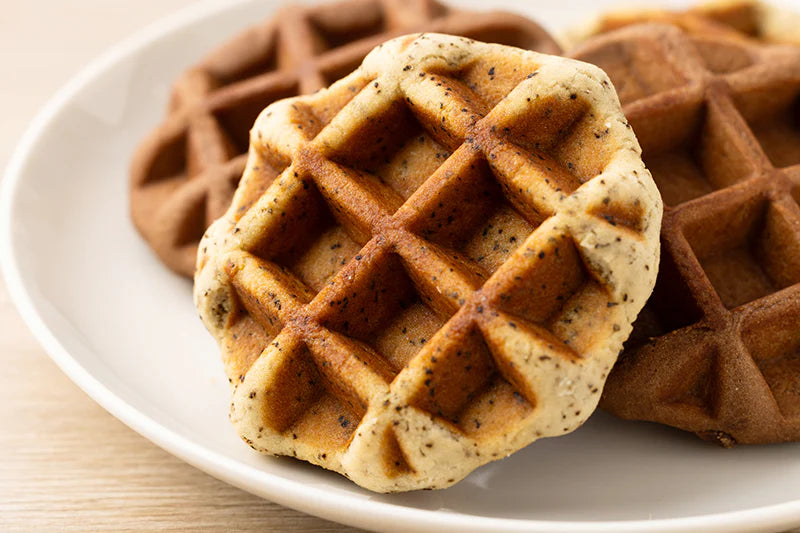 全粒粉やおからを使って焼き上げた、むぎゅっと食感のワッフルはアールグレイ味とココア味の2種類。