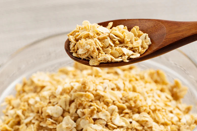 オーツ麦と大麦を、ざくっと食感に丁寧に焼き上げた、やさしい甘さの「オートミールグラノーラ」です。りんごの甘い香りに、シナモンがアクセント。軽やかな焼菓子のような味わいです。