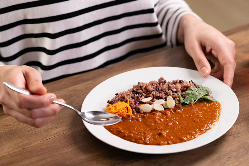 カレーと黒米と玄米ご飯をそれぞれ電子レンジで調理すれば、まるでお店のような本格的なカレーの出来上がり。