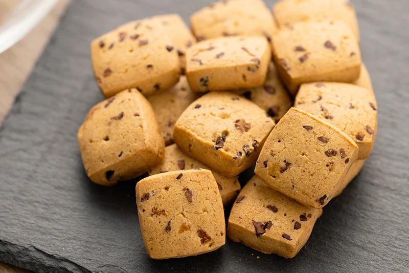 オレンジとカカオニブを練りこんだ、さくっと食感が特徴です。ほんのり広がるバターの香りと、かりっとほろ苦いカカオニブの風味をひと口サイズでお楽しみください。