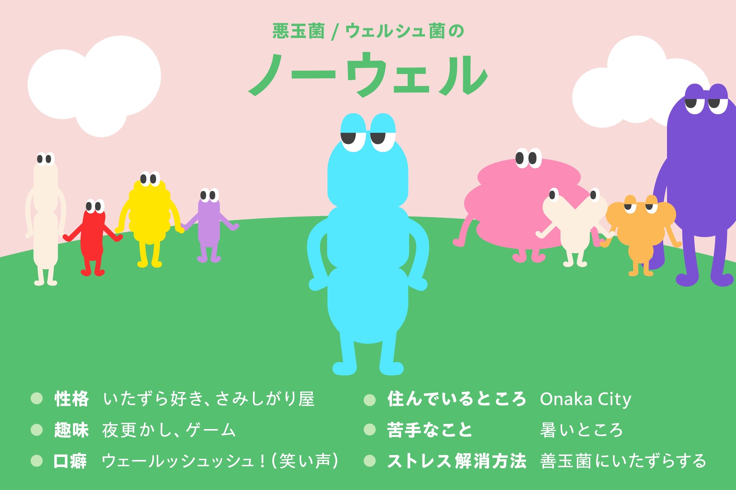 悪玉菌の親分でエシェを弟分にしているウェルシュ菌。本当はみんなと仲良くなりたいと思っているけど、気持ちを伝えるのが下手です。いつも愛情の裏返し的に、いたずらをして、みんなを困らせてしまうことも。