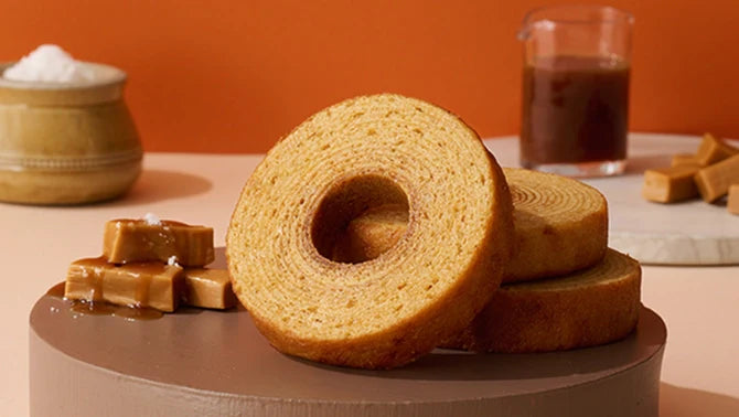 キャラメルの濃厚な味わいをゲランド海塩で引き立たせたこだわりのバウムクーヘンです。おからと玄米を使用し、やさしく仕上げました。