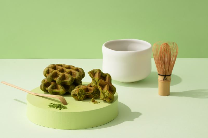 全粒粉やおからを使ってしっとり焼き上げた、むぎゅっと食感のワッフルです。抹茶の上品で、深みのある味わいに仕上げました。むぎゅっと食感なので腹持ちがよく、小腹満たしにぴったりです。