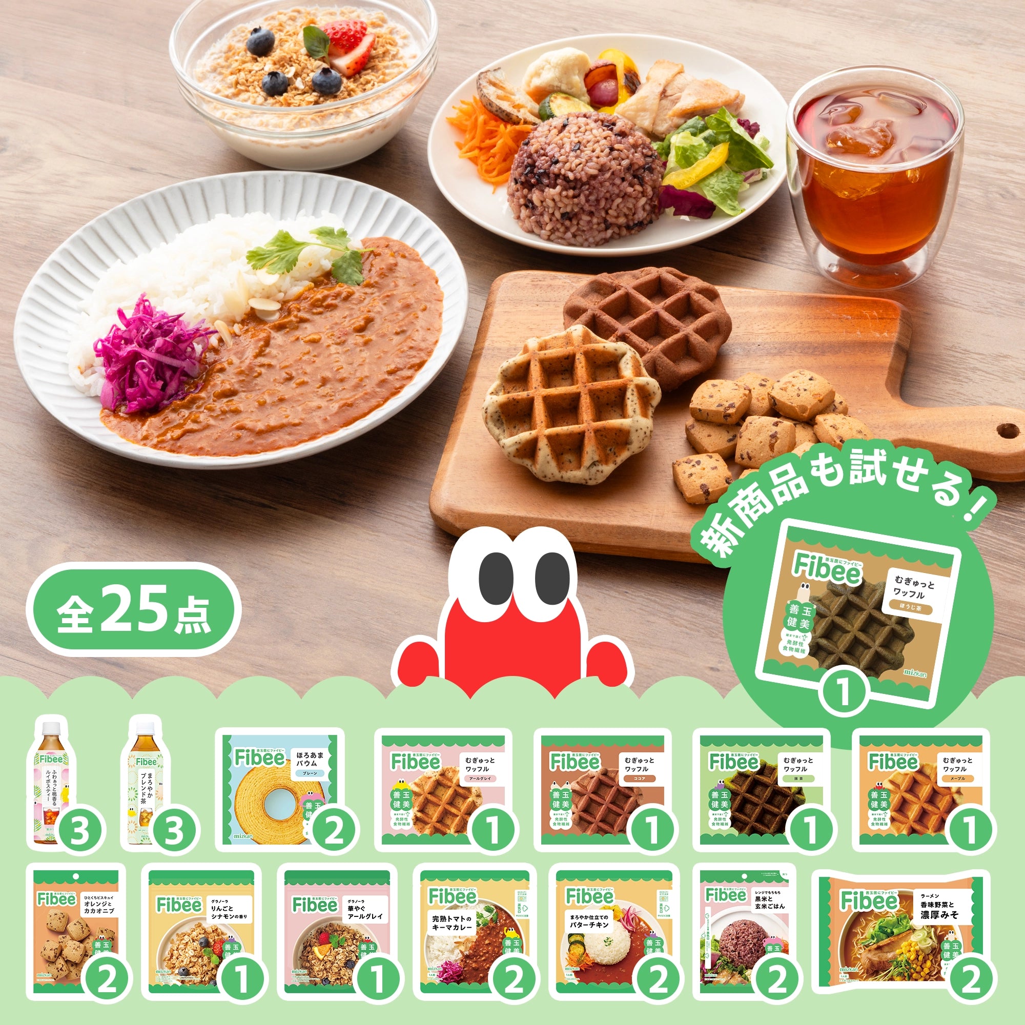 「Fibeeお手軽10種セット」になります。ワッフルからカレーまで様々な種類のFibeeが入っており、様々なシーンに活躍する詰め合わせになります。初回から中身を自由に組み替えていただくことも可能です。2回目以降はマイアカウントにて中身のご変更をいただくこともできます。