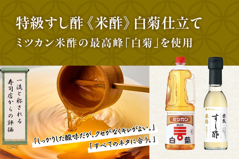 「特級すし酢 米酢 白菊仕立て」はネタの旨味際立つ、”上品な酸味”が特徴です。幅広いネタと相性がよく、特に鯛やブリなどの白身系の魚がよく合います。