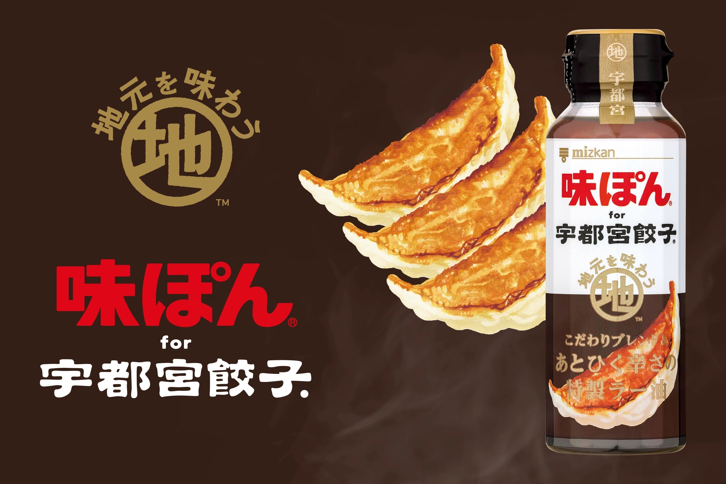 「味ぽんfor宇都宮餃子」は、味ぽんをベースにしながら、最適な酢・醤油・柑橘果汁を選び抜き、宇都宮餃子のおいしさを引き立てる特別な配合比でブレンド。あとひく辛さが特徴の、唐辛子・山椒・ブラックペッパーの3種を使用した特製ラー油で仕上げました。