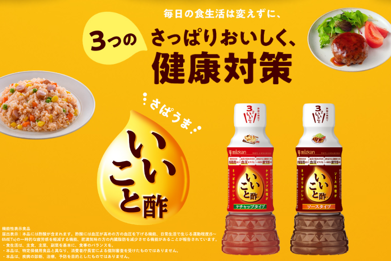 毎日の食生活は変えずにさっぱりおいしく3つの健康対策ができる機能性表示食品の調味酢です。ソース・ケチャップと同様にお使いいただけます。つけかけに使用でき幅広いメニューと相性抜群です。